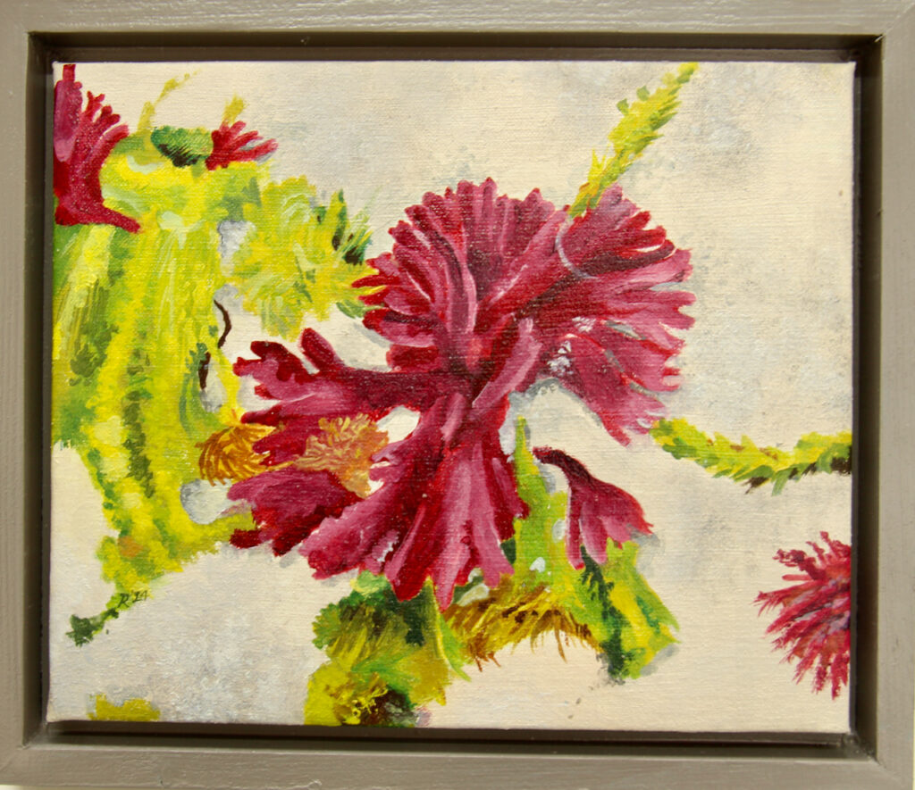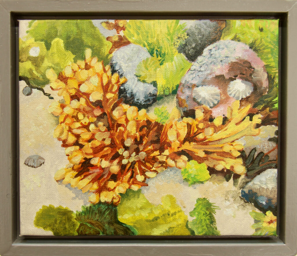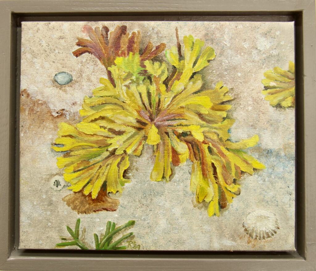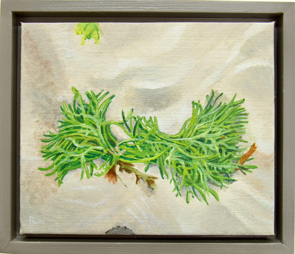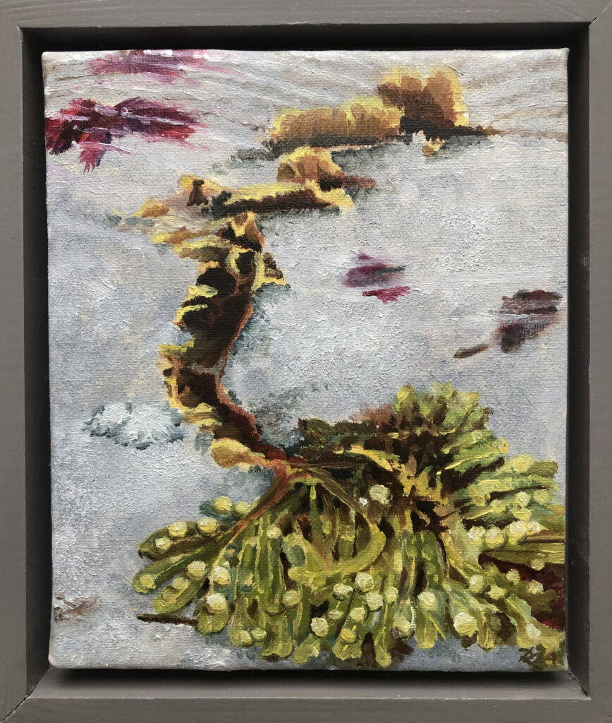 6 kleine panelen met olieverf op doek in grijze baklijst – 24/28 cm, 2024. Paneel 6 uit 2025.