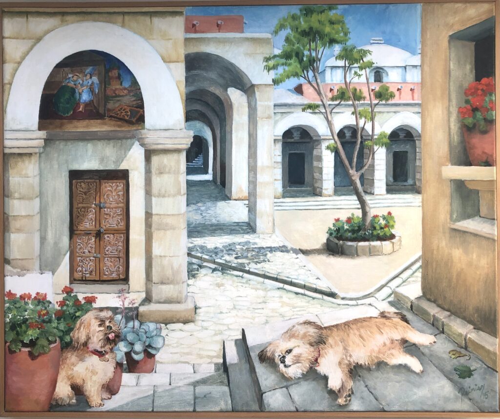 Deel een van drieluik: Het klooster van Santa Catalina , Arequipa, Binnenplaats met een waterzuiveringssteen, 2013, olieverf op doek.