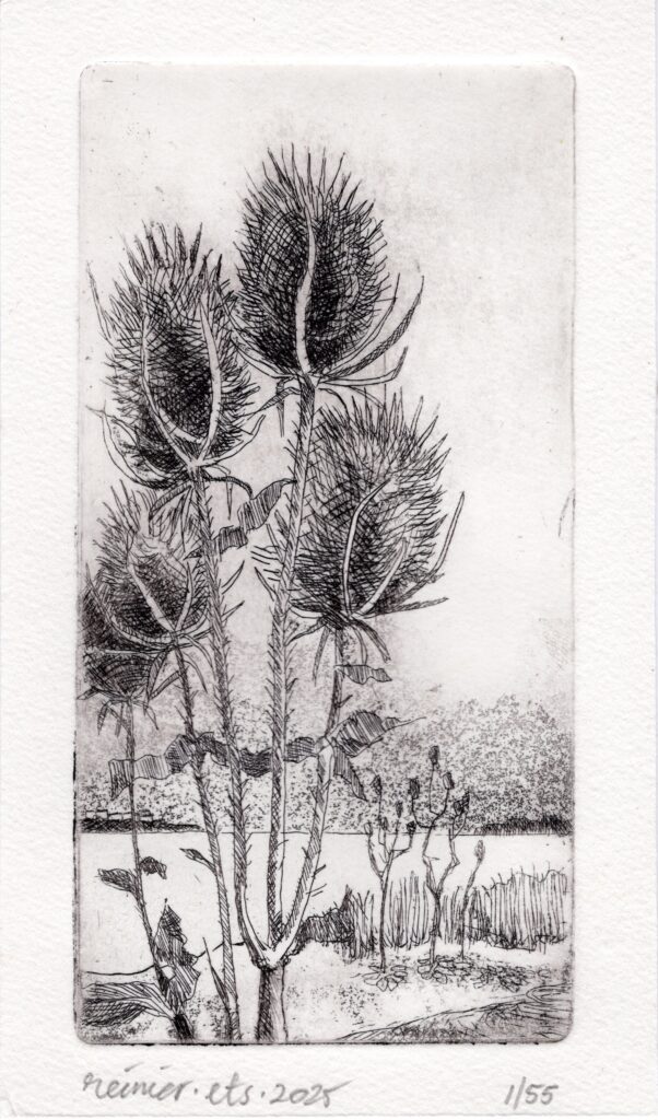 Nieuwjaars- ets-aquatint 2025/2026 “kaardenbollen in het voorland” voorzien van de tekst: Wij wensen je een prikkelend maar niet stekelig …. 2026.